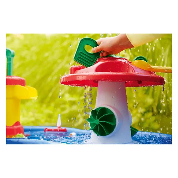 Het educatieve speelidee biedt veel spannende leermomenten en legt op speelse wijze de natuurkundige wetten van het element water uit. De kleurrijke watertafel heeft een grote paddenstoel met fontein-, plons- en watervalfuncties. Bevestig snel de waterslang aan de gestandaardiseerde slangaansluiting aan de onderkant van de watertafel en je bent klaar om te gaan – afhankelijk van de waterdruk komt er een kleine of grote fontein uit de paddenstoel! Hier leren kinderen zelf water beheersen. Eerst moet het opgevangen worden in de bakjes op de paddestoelhoed, zodat later door het openen van de sluizen een krachtige waterval of een zacht regengordijn kan ontstaan. De sloten en draaischroeven op de paddenstoel dagen de motoriek van de kinderen extra uit en breiden deze op een speelse manier uit.