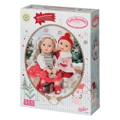 De Baby Annabell Adventskalender zit propvol kleding en accessoires in klassieke rode en groene tinten. De kleine pop ontspant tijdens de kerst in een tweedelige outfit met rendier-, kerstzuurstok- en kerstboommotieven. Tijdens het relaxen sabbelt ze op haar speentje of kauwt ze op haar bijtring. En natuurlijk wil ze in de adventsperiode soms ook naar buiten. Met een muts, oorwarmers, wanten en een zonnebril is Baby Annabell perfect gekleed voor een kerstmarkt. Als ze kerstkoekjes eet, doet ze haar slabbetje met de vleugels om en drinkt ze melk uit haar flesje. Haar feestelijke outfit bestaat uit een rode glitterjurk, fluwelen sjaal, tulen rok met gouden sterren, hartvormig tasje met rozen, schoenen met kroontjes erop en natuurlijk vleugels.