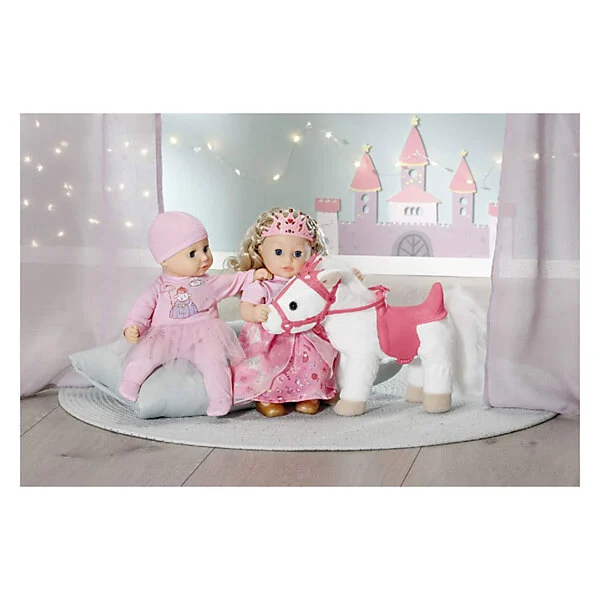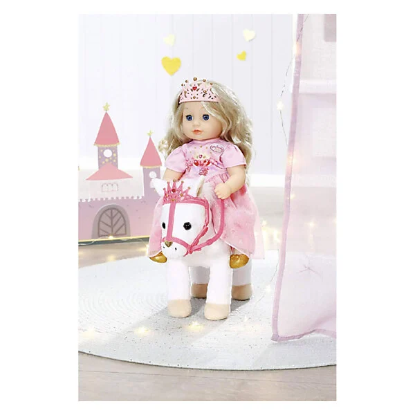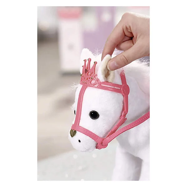 Deze witte pony heeft een koninklijk zadel en hoofdstel met een glinsterende kroon waar zijn grappige, alerte oren achter vandaan piepen. Als je in zijn rechteroor knijpt, begint de pony te hinniken of snuiven. Knijp je in zijn linkeroor, dan hoor je hoefgetrappel. Little Annabell is stapelverliefd op haar dierenmaatje en geeft haar pony vaak een kusje op zijn neus. Hij antwoordt haar dan met zijn eigen kusgeluid. De kleine prinses zit comfortabel in het zadel tijdens de rit, omdat de poppenhouder ervoor zorgt dat ze er niet afvalt.
