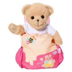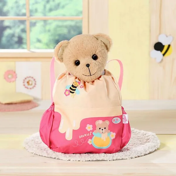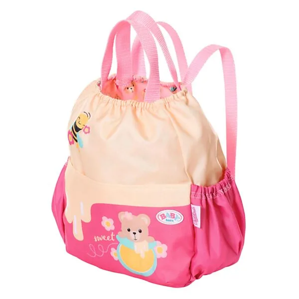 De rugzak in het honinggeel en bloesemroze is zo ontworpen dat BABY born Beer alles kan overzien tijdens de rugzakreis. Binnenin en in de twee zijvakken is voldoende ruimte voor alles wat knuffelberen en berenouders onderweg nodig zouden kunnen hebben. De roze riempjes zijn verstelbaar en kunnen worden aangepast aan de grootte van het kind.
