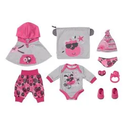 De set omvat een grijze romper met roze manchetten en broek met speels motief. De outfit wordt geleverd met bijpassende roze schoenen. Als het kouder wordt, draagt BABY born ook de poncho met capuchon. Misschien zet ze ook de muts op en doet ze het halsdoekje om, gewoon voor de zekerheid.