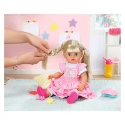 Ze drinkt haar water niet uit haar flesje, maar uit een bidon. Als het tijd is om naar bed te gaan, maakt ze stampij en huilt echte poppentranen. Ze is geen klein meisje meer, dus waarom moet ze gaan slapen? Maar als je haar op haar rug legt, sluit ze braaf haar slaapogen. Ze vindt het ook heerlijk als je haar in bad stopt en haar haar stylet met de inbegrepen haaraccessoires.