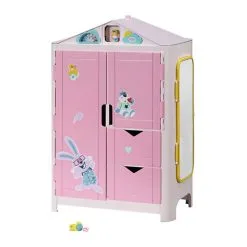 Deze witte kledingkast heeft twee laden en een grote en een kleine deur met roze afwerking. Je kunt hem nog mooier maken met de kleurrijke stickers. Aan één van de zijden zit een inklapbare spiegel die een geheim vak verbergt. Kun jij de geheime eendvormige sleutel vinden?
