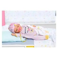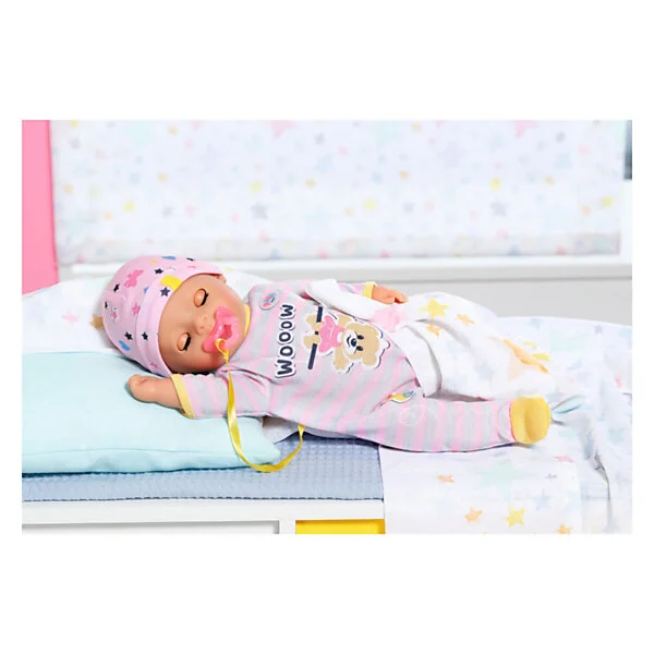 Na de lunch is het tijd om een dutje te doen. Als je deze kleine pop op haar rug legt, dan sluit ze haar slaperige ogen. Soms heeft ze ook haar speentje nodig om in slaap te vallen. Het is op haar speelpakje genaaid, zodat het niet onder het bed verdwijnt of onderweg kwijtraakt.