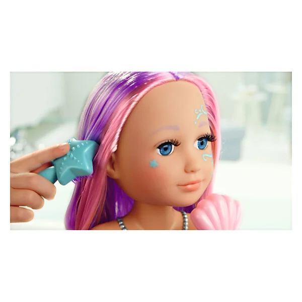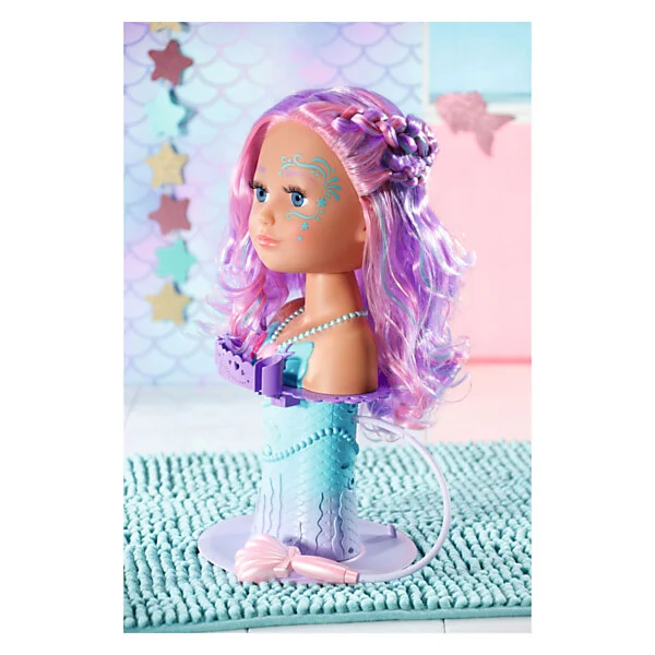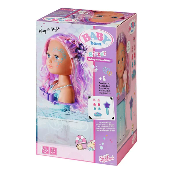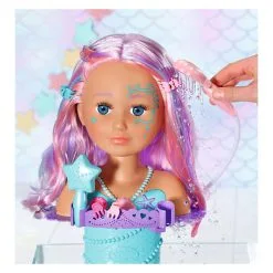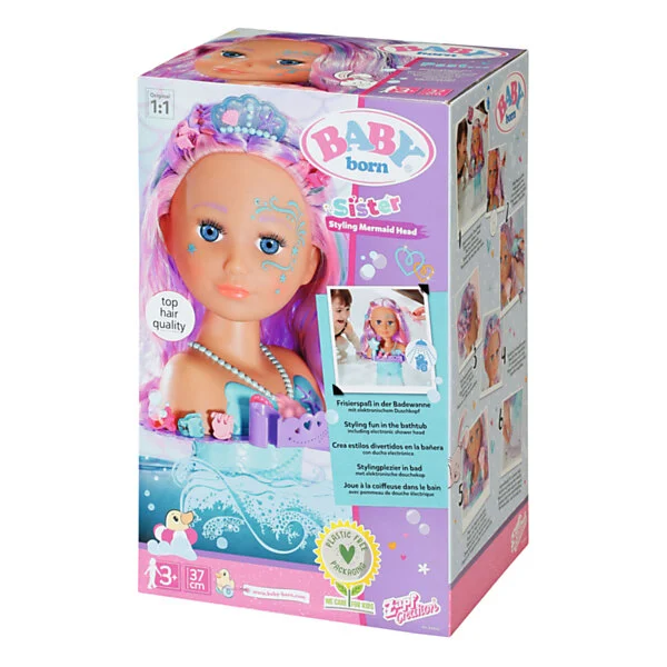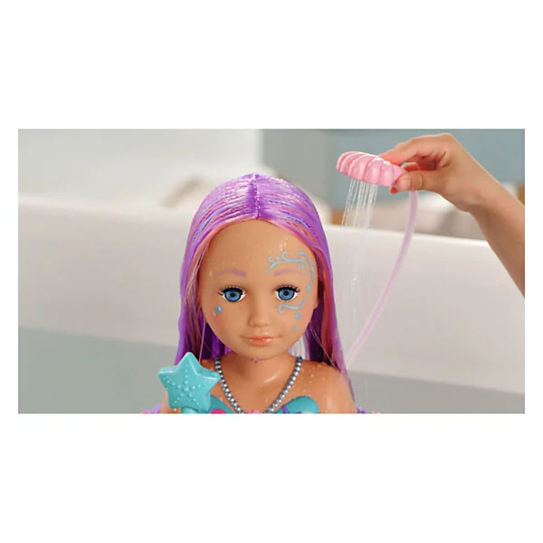 BABY born Sister Stylinghoofd Zeemeermin met elektronische douchekop. Inclusief haarborstel, tiara en 6 haarclips.