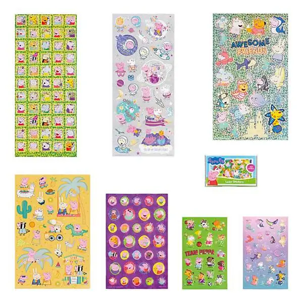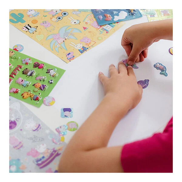 7 stickervellen in verschillende materialen en schattige Peppa dessins