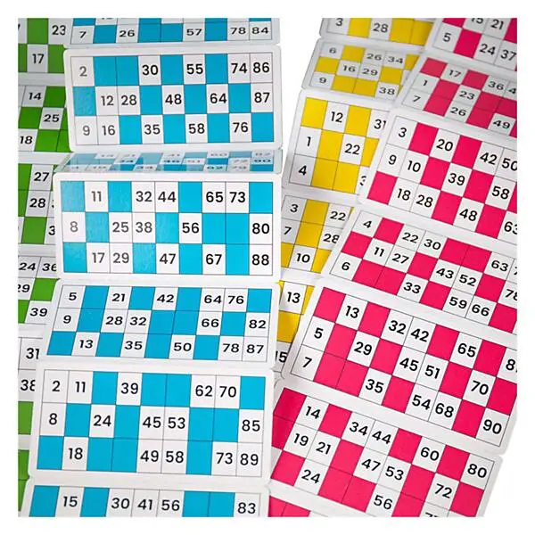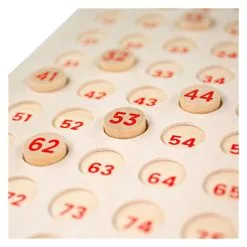 Inhoud: 105 houten fiches, bingobord, en bingokaarten in 4 verschillende kleuren.