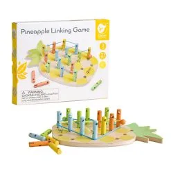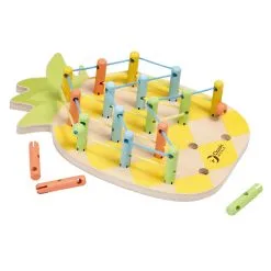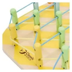 Gebruik de bijgevoegde instructiekaarten voor ideeën of laat de fantasie de vrije loop gaan. De draden kunnen op twee verschillende hoogtes door de houten ‘paaltjes’ geregen worden om een driedimensionaal patroon te maken. Een leuk spel dat tegelijkertijd de fijne motoriek, hand-oogcoördinatie en het ruimtelijk inzicht stimuleert.