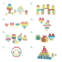 De blokken zijn gemaakt van duurzaam gewonnen hout en bewerkt met milieuvriendelijke materialen. De set bevat 68 blokken en is geschikt voor kinderen vanaf 18 maanden.