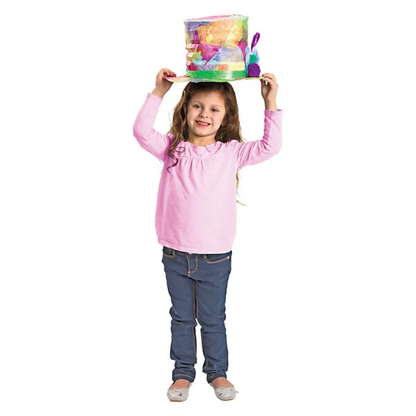 • WAT JE KRIJGT: 12 hoge hoeden, elk 32 cm in diameter en 20,5 cm hoog wanneer uitgevouwen. Hoeden worden plat geleverd en strekken zich hoog uit. Eén maat die de meeste kinderen zal passen.