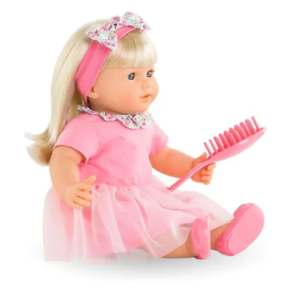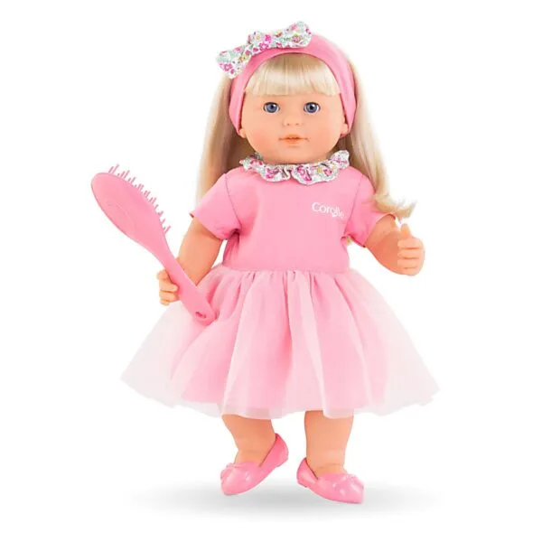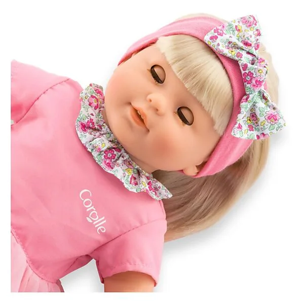 Haar gezicht, armen en benen zijn gemaakt van zachtvoelend vinyl die de kernmerkende vanillegeur van Corolle hebben. Adèle heeft blauwe ogen en is gekleed in een zachtroze jurk, versierd met borduurwerk en een bloemenkraag. Ze draagt een roze haarband met een bloemrijke strik en een paar roze ballerina’s.