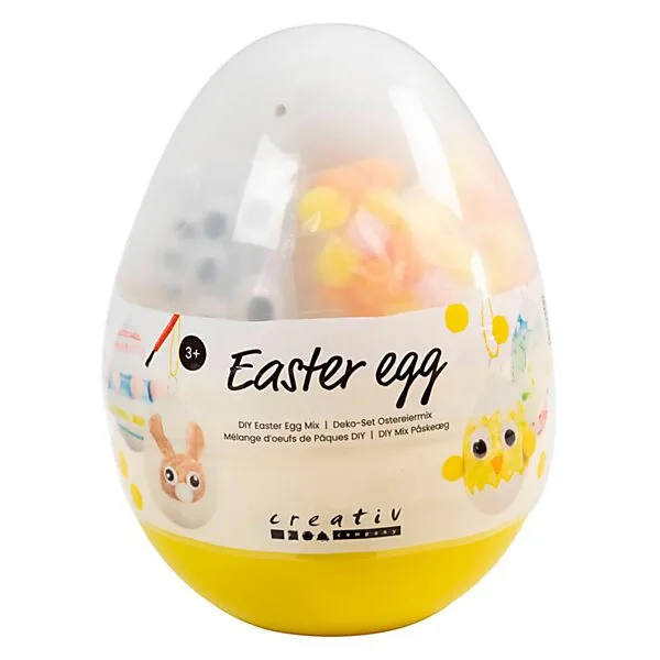 Inhoud: plastic ei, waterverfpalet met penseel, wiebelogen, pom-oms, lijm, touw en hanger.