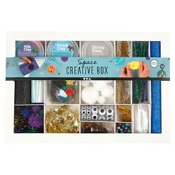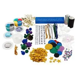 Inhoud: Foam Clay, Silk Clay, Sticky Base, glitterpapier, iriserend papier, glitter pom-poms, diverse pailletten, zelfklevende wiebelogen, acryl kralen, goudkoord, EVA foam figuren met glitter, piepschuim balletjes, metallic chenille draad, iriserende cellofaanlametta en metaaldraad met sterren.