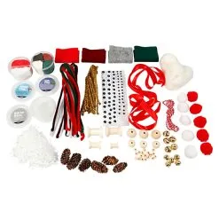 Silk Clay, Foam Clay, Sticky Base, zelfklevende wiebelogen in diverse maten, chenille in meerdere kleuren, pom poms in diverse kleuren, zijden lint, metalen chenille, belletjes in diverse maten, dennenappels, houten kralen in meerdere maten, katoenen draad, gigantisch polyacrylgaren, viltvellen in diverse kleuren, kunstmatige sneeuw, houten katoenen haspels in meerdere maten.