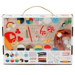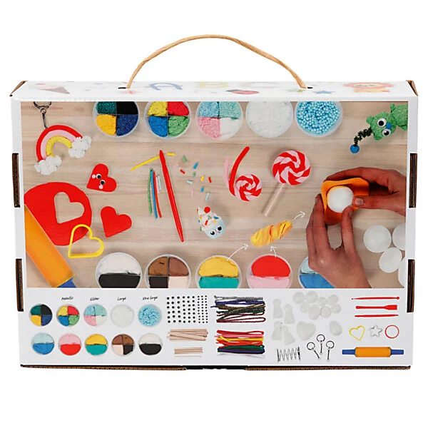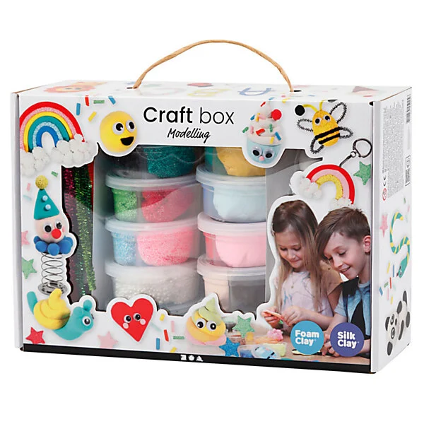 Inhoud: Silk Clay, Foam Clay, Foam Clay glitter, Foam Clay L, Foam Clay XL, deegroller, uitsteekvormpjes, modelleerstaafjes, piepschuim lijfje, piepschuim hart, piepschuim balletjes en eieren, houten stokjes, ijslollystokjes, zelfklevend wiebelogen, een veer en sleutelhangers.