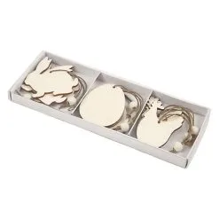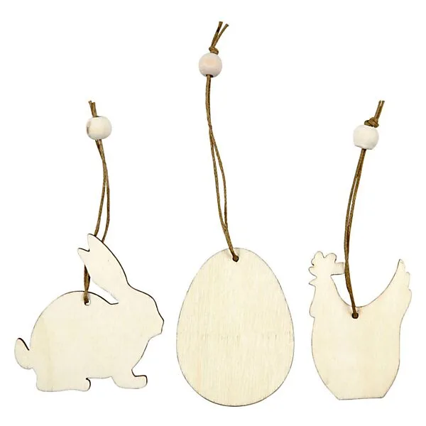 De houteh hangers hebben een een touwtje met een kraal om ze op te hangen. De hangers hebben een doorsnede van ca. 6 centimeter.