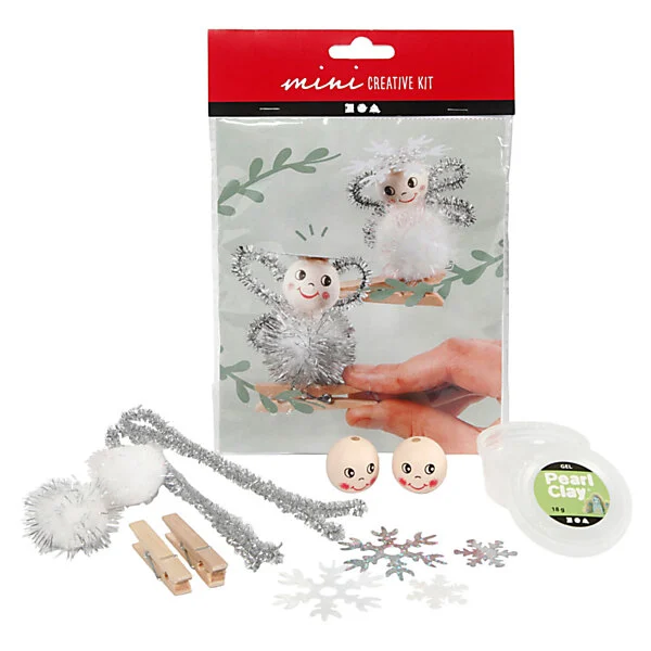 Inhoud: wattengezichten, metallic pom poms, metallic chenille, Sticky Base, houten knijpers en pailletten