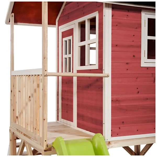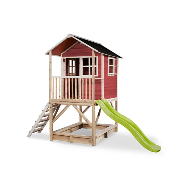 De speelhuisjes van EXIT Toys zijn gemaakt van FSC® gecertificeerd cederhout (FSC 100%, FSC® SCS-COC-007799). Deze houtsoort splintert niet en is van nature bestand tegen weersinvloeden zoals regen en dus resistent tegen houtrot. Het EXIT Loft 500 speelhuis heeft daarnaast een waterdicht bitumen dak, waardoor kinderen er in weer en wind mee kunnen spelen. Je hoeft EXIT houten speelhuisjes voor gebruik niet te behandelen, kinderen kunnen er direct veilig mee spelen.