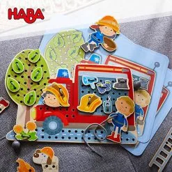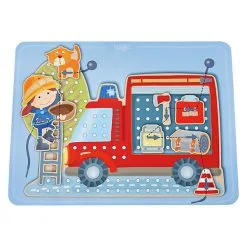 Inhoud: 1 brandweerauto, 38 rijgplaatjes, 2 voorbeeldkaarten (aan beide kanten bedrukt).