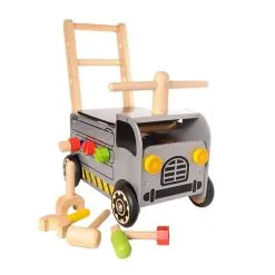 Er zitten verschillende houten gereedschappen opgeborgen onder de houten zitting van de truck, waaronder een hamer, schroevendraaiers en schroeven. Bij de handgrepen zitten uitsparingen waar de speelgoedschroeven precies in passen. Zo oefent je kindje meteen alvast met wat klusvaardigheden en wordt de fijne motoriek getraind. Ook aan de zijkant zijn uitsparingen te vinden voor de grote, houten schroeven.