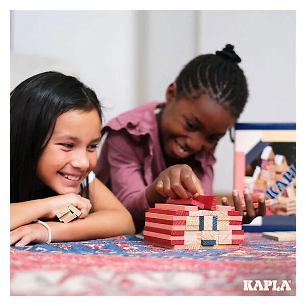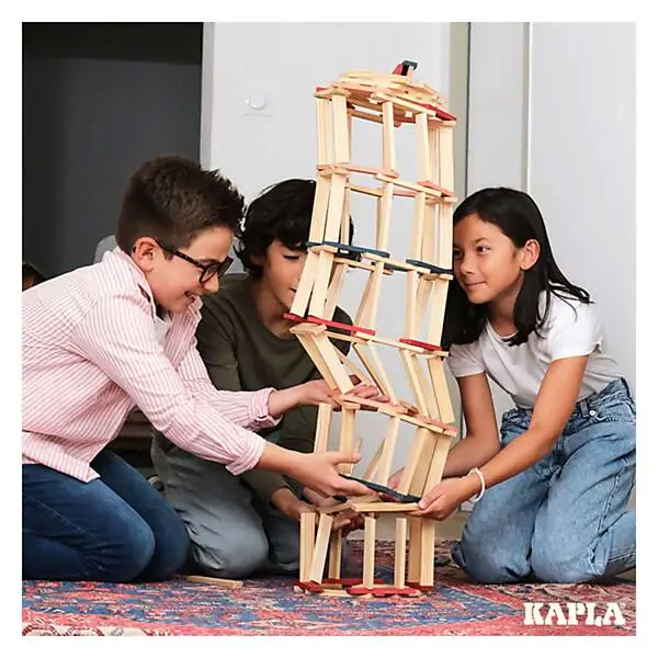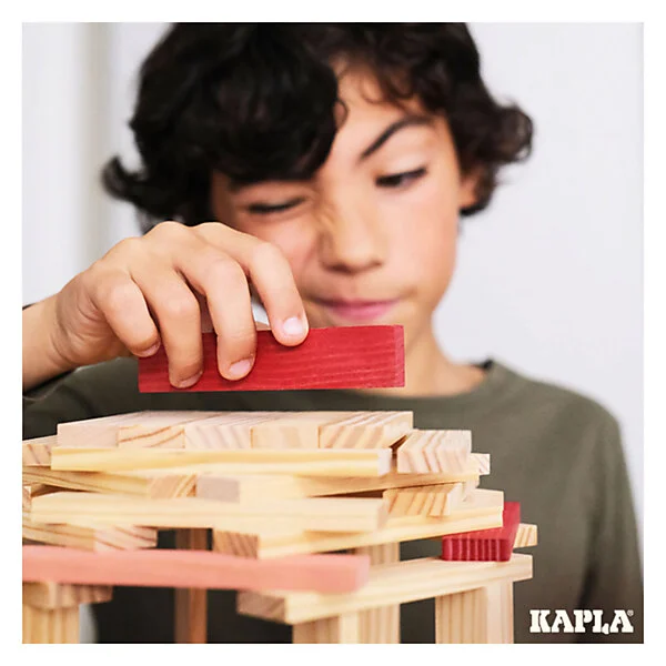 Met de KAPLA-plankjes met identieke afmetingen kan oneindig worden gespeeld en gecreëerd. De plankjes worden eenvoudigweg gestapeld, zonder lijm of bevestiging en kan je bouwen wat in je hoofd opkomt… Een KAPLA-werkje is vergankelijk van nature, en het afbreken is soms net zo prettig als het bouwen. De volgende dag ontstaan met dezelfde plankjes een nieuw universum en andere denkbeeldige structuren…