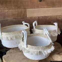 De drie opbergmanden voor speelgoed hebben franjes en stevige handgrepen van touw. Ze zijn gemaakt van katoen en grasvezels en elk exemplaar is uniek. In de set zitten drie manden in drie formaten: klein, medium en groot. De afmetingen zijn als volgt (doorsnede x hoogte):