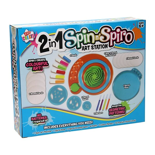 Pak een blaadje en kies een mooie vorm uit om mee te tekenen. Bevestig alle hulpmiddelen in de spirograafmachine en verf en teken erop los! Zie hoe creatieve vormen en kleuren een uniek ontwerp creëren.