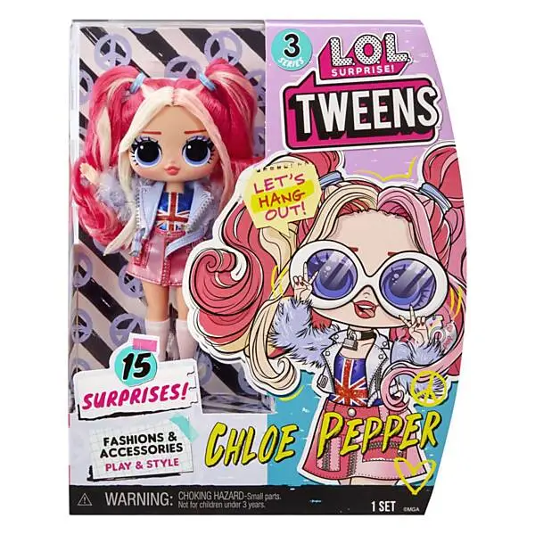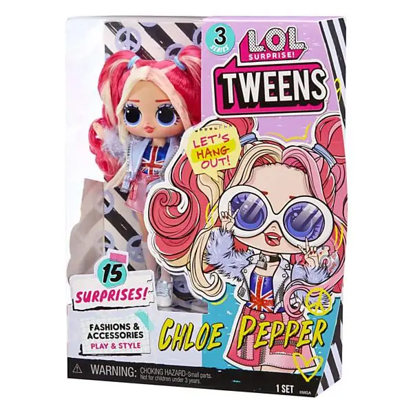 Maak kennis met de populaire L.O.L. Surprise Tween-modepoppen van serie 3: hallo, Chloe Pepper! Chloe is een getalenteerde muzikante die net haar eerste album heeft uitgebracht en die graag haar eigen nummers schrijft. Ze staat bekend om haar pakkende popliedjes en waanzinnige dansmoves. Bovendien is ze de grote zus van de L.O.L. Surprise-rockster Cheeky Babe. Pak 15 verrassingen uit, waaronder een Tweens-modepop, met een supermooi gezichtje, prachtig haar en haar eigen fantastische stijl. Elke doos is inclusief een L.O.L. Surprise Tweens-modepop, een fenomenale outfit, accessoires, een haarborstel en een poppenstandaard. Verzamel alle 4 de L.O.L. Surprise Tweens van serie 3: Chloe Pepper, Nia Regal, Marilyn Star en Emma Emo!