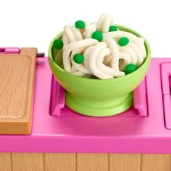 – De Speelset is inclusief een Barbie pop, een noedel-werkstation, 2 emmertjes klei (één met witte klei en één met groene klei), een kom met deksel, een extra kom om uit te eten, een speelgoedmesje en 2 paar stokjes.