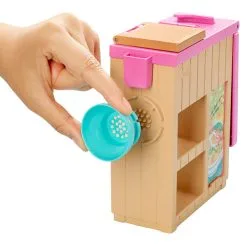 Ontdek de wereld van noedels met de Barbie Noedelbar Speelset! Als je van koken houdt, probeer dan eens om noedels te maken! De Barbie Noedelbar Speelset bevat een Barbie pop met een professionele outfit met een leuke ‘eten’-print erop, een noedel-werkstation en accessoires. Neem de witte klei uit het ene emmertje (in het andere emmertje zit groene klei) en stop die in het gat in het midden van het werkstation. Schuif dan de noedelkom met de deksel over het gat en druk de zijplank naar beneden. Je ziet de noedels als vanzelf in de kom vallen, het lijkt wel magie! Zo leuk! Je wilt er natuurlijk ook groente bij, daarvoor gebruik je de groene klei. Stop de klei in de vorm aan de andere kant van je werkstation en druk het deksel erop. Haal het deksel omhoog en je hebt broccoli gemaakt! Je kunt het teveel aan deeg wegsnijden met het mesje. Snijd de broccoli daarna in stukjes en voeg de groente toe aan je noedels! Barbie deelt graag met haar vrienden, daarom zitten er een extra kom en twee paar stokjes bij. Hmm, dit zijn de allerlekkerste noedels! De Barbie Noedelbar Speelset bevat een Barbie pop, een noedel-werkstation, 2 emmertjes klei (wit en groen), een speelgoedmesje en 2 paar stokjes. Pop kan niet los staan. Afwijkende kleuren en versieringen mogelijk. Vanaf 4 jaar.