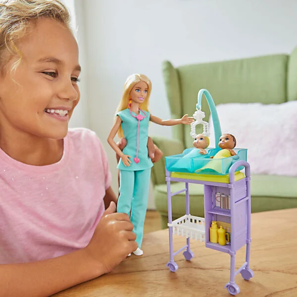 Ontdek de wereld van het verzorgen met de Barbie Babydokter speelset! Wanneer een kind met Barbie speelt, fantaseert ze over alles wat ze later kan worden. Vind je het leuk om voor baby’s te zorgen? Misschien moet je dan maar babydokter worden! Deze speelset bevat alles wat babydokters nodig hebben, met een Barbie babydokterspop en schattige kleine patiëntjes! Babydokters zijn aardig en slim, en zorgen ervoor dat baby’s blij en gezond blijven. Deze speelset bestaat uit een losstaande onderzoekstafel met lotionfles en andere accessoires, een mobiele en twee wiegjes voor de kleine patiëntjes. Barbie Babydokterspop kan met haar stethoscoop naar de hartslag van de baby’s luisteren en deze op het klembord noteren. Ze doen het geweldig! De speelset bestaat uit een Barbie Babydokterspop met lichtgroene dokterskleding, stethoscoop en klembord, en 2 baby’s die in schattige dekentjes zijn gewikkeld. De set bevat een onderzoekstafel met lotionfles en andere accessoires, een mobiele en twee doorzichtige wiegjes voor de kleine patiëntjes. Kinderen vinden het heerlijk om hun creativiteit de vrije loop te laten en talloze verhalen te bedenken! Pop kan niet los staan. Afwijkende kleuren en versieringen mogelijk. 3 jaar en ouder.
