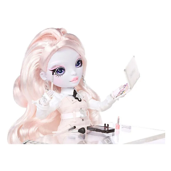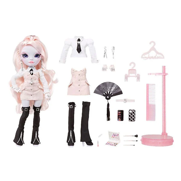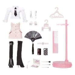 Inclusief: modepop, complete poppenoutfit, een paar poppenschoenen, poppenaccessoires, ventilator, mobiele telefoon en etui, make-uppallet, borstels en poppenstandaard.