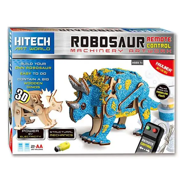 De set bevat een grote houten dinosaurus, een afstandsbediening en modeleer foam.