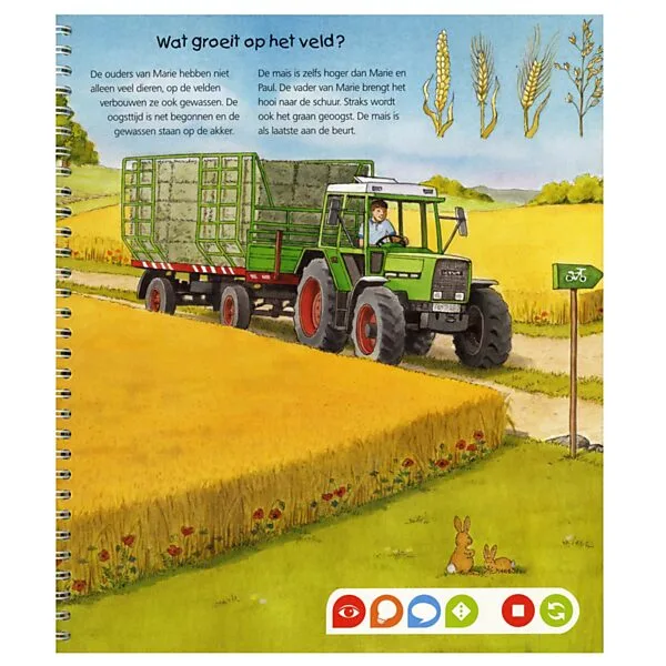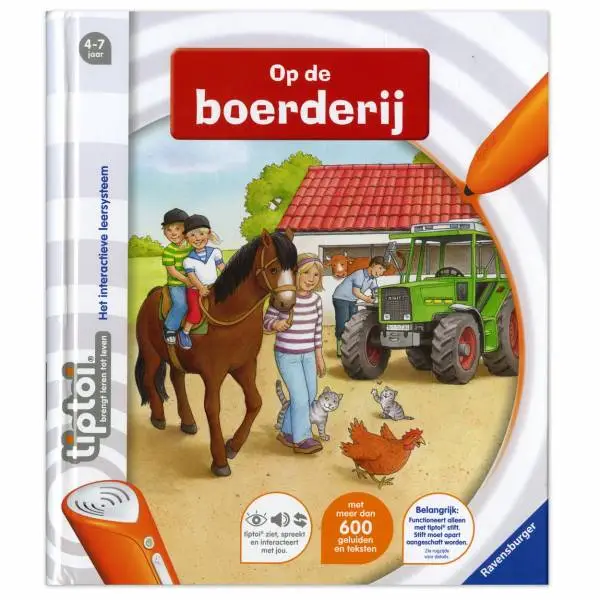 Met de boeken uit de tiptoi collectie is van alles te ontdekken over spannende thema’s. Verhalen, wetenswaardigheden, spelletjes! Met meer dan 600 geluiden per boek zit tiptoi vol plezier en verrassingen. Met tiptoi worden dieren en machines tot leven gewekt. In dit boek wemelt het van de geluiden, verhalen en spelletjes! Een boek vol geluiden over het leven op de boerderij. Beleef met nieuwe interactieve mogelijkheden het boerderijleven. Basiskennis op een nieuwe manier verteld. Met liedjes, afbeeldingen en teksten.