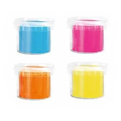 De Feel good Happy klei bestaat uit de vrolijke kleuren felroze, lichtblauw, oranje en geel.