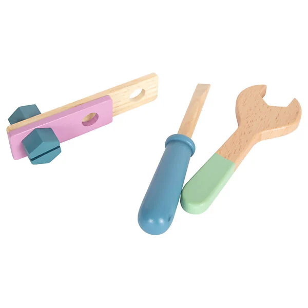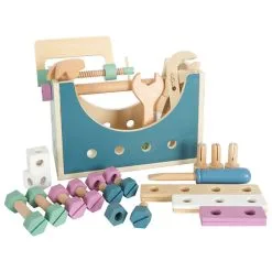 De set bestaat onder andere uit een steeksleutel, een schroevendraaier, een hamer, schroeven, moeren en plankjes. Hiermee kun je aan de slag gaan om bouwwerkjes in elkaar te zetten. Spelenderwijs ontwikkelen de motoriek en inzicht zich bij het kind.