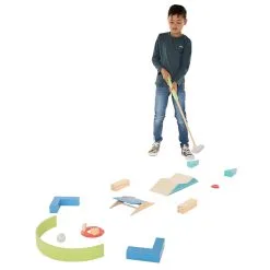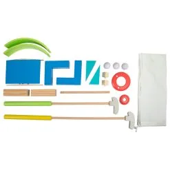 Daarnaast zijn er bij de set allerlei hindernissen te vinden om een leuk parcours te creëren in of rondom je eigen huis. En natuurlijk kunnen golfballetjes en golfgaten niet ontbreken. De meeste onderdelen zijn gemaakt van duurzaam hout.