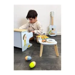 Het is zeer motiverende alles-in-één muziek- en leerplezier! Visueel valt deze muziek- en klanktafel op door zijn vrolijke design en de harmonieuze combinatie van natuurlijk hout en moderne blauwe kleuren. Naast het trainen van akoestische waarneming, traint dit instrument op speelse wijze ook een gevoel voor ritme en beat en een eerste begrip van muzikale tonen.