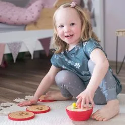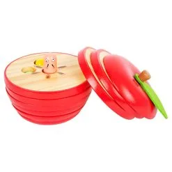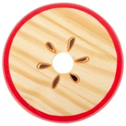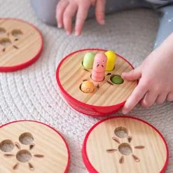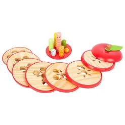Omdat de rupsen verschillende lengtes hebben en elke appelschijf één opening minder heeft dan de vorige, is er maar één pad helemaal door! Hier is een tip om het doolhof op te lossen: de ene zie van het klokhuis heeft een donkerdere kleur dan de andere en zit op dezelfde plek op elk stuk. Dit maakt het correct inbrengen gemakkelijker! Welke rups vindt als eerste zijn weg door de appel?