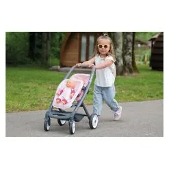 Het stevige metalen frame heeft ergonomische handgrepen en dempende, stille zwenkwielen. Geluidloos wandelen met de poppenwagen dus, binnen én buiten! Onderin de poppenwagen is een ruim boodschappenvak voor al je belangrijkste poppenbenodigdheden. De kunststof zittingen hebben comfortabele hoezen van roze stof.