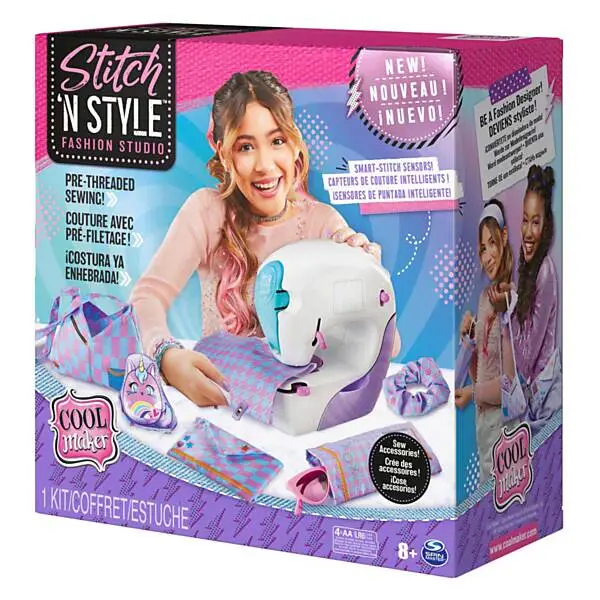 Inhoud: 1 Cool Maker Stitch �??N Style Fashion Studio naaimachine, 1 garenpatroon, 1 stempel, 2 naaiclips, 1 liniaal, 1 draadinsteker, 1 strook bedrukte stof, 1 vel decoratieve watertransferprints, 1 stuk plat elastiek, 1 ronde elastiek, 1 gebruiksaanwijzing