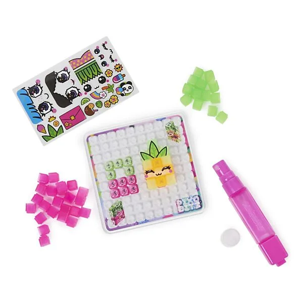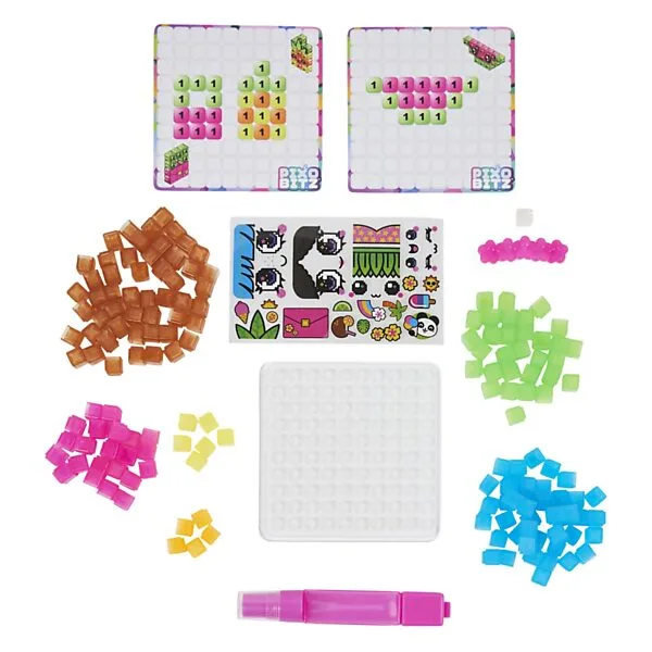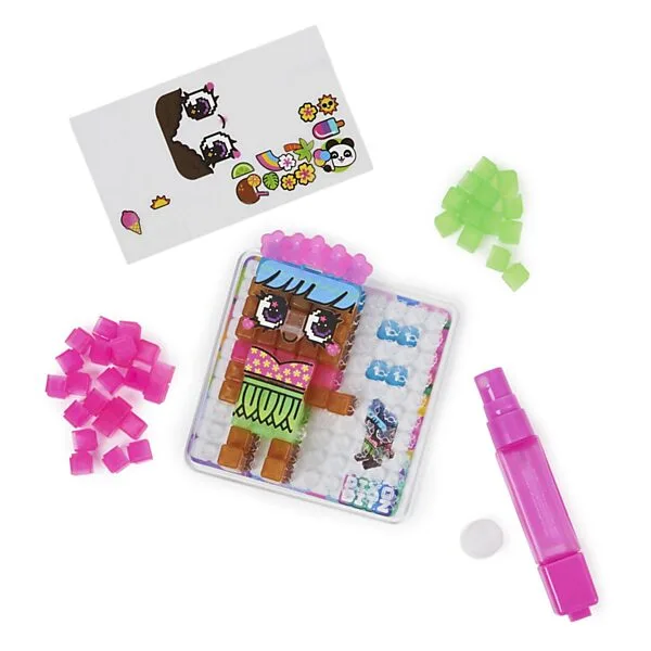 Inhoud: 156 bitz (kubusvormige watersmeltkralen) in 6 kleuren, 2 accessoires, 1 decoratievel met waterstickers, 1 sprayfles, 1 blad, 2 sjablonen, 1 gebruiksaanwijzing