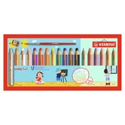 Met de STABILO woody 3 in 1 kan zowel op papier of karton als op gladde oppervlakken, zoals ramen, kunststof, regenlaarzen, broodtrommels, leer en steen worden gekleurd. Dekt zelfs op zwarte ondergronden. Met een kwast en water erbij kunnen prachtige kunstwerken worden gemaakt. De woody 3 in 1 kan weer heel gemakkelijk van harde, niet poreuze, gladde oppervlakken worden verwijderd, zoals ramen.