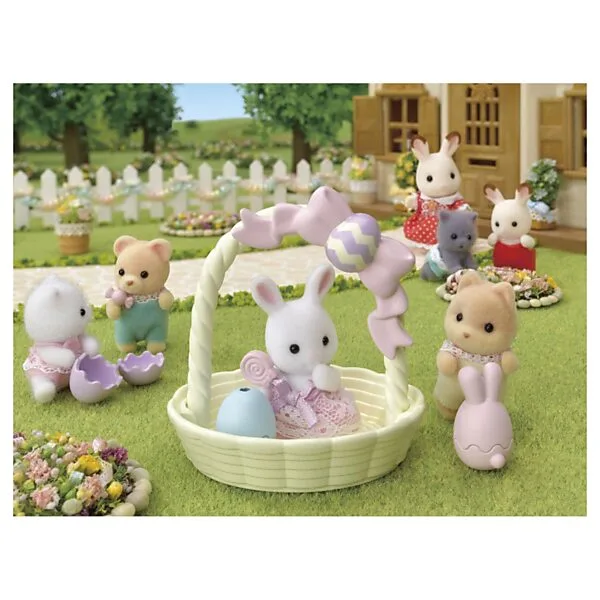 Baby sneeuwkonijn, mand, konijnenei (bovenkant), konijnenei (onderkant), ei (blauw/bovenkant), ei (blauw/onderkant), ei (paars/bovenkant), ei (paars/onderkant), snoep A, snoep B, snoep C, kippenfiguur (in totaal 12 onderdelen)