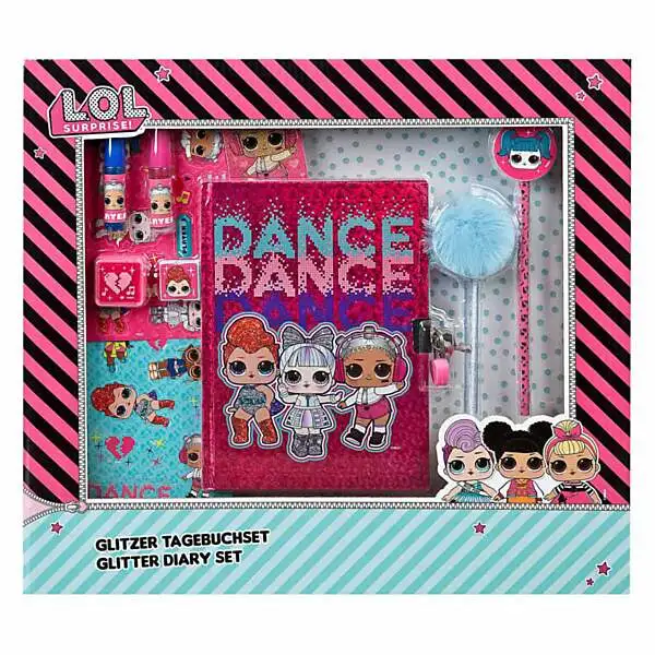 Inhoud: glitter dagboek met hartvormig slot en 2 sleutels, twee kleuren glitterlijm, stempel, stempelkussen, pen met donzige pompom bovenop, potlood met gum bovenop, 2 stickervellen en 1 grote metallic sticker. Geschikt voor kinderen van 3 tot 8 jaar oud.